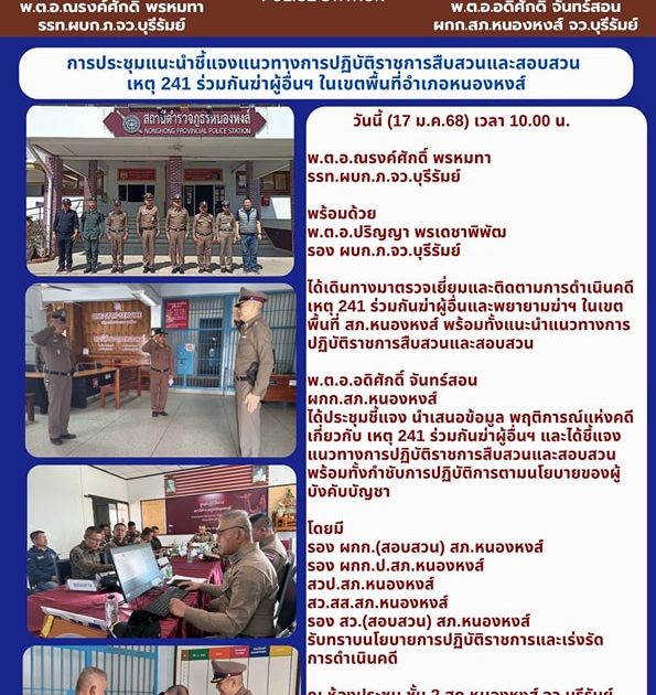 ได้ประชุมชี้แจง นำเสนอข้อมูล พฤติการณ์แห่งคดีเกี่ยวกับ เหตุ 241 ร่วมกันฆ่าผู้อื่นฯ และได้ชี้แจงแนวทางการปฏิบัติราชการสืบสวนและสอบสวน พร้อมทั้งกำชับการปฏิบัติการตามนโยบายของผู้บังคับบัญชา