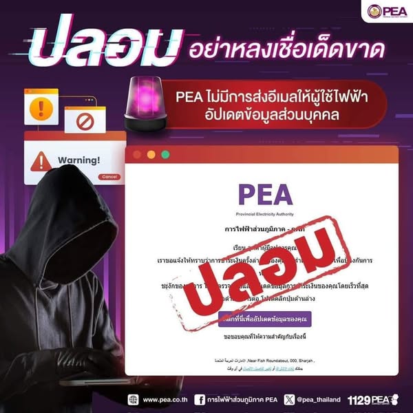 PEA เตือนระวังกลุ่มมิจฉาชีพ ส่งอีเมลให้ผู้ใช้ไฟฟ้าอัปเดตข้อมูลส่วนบุคคล